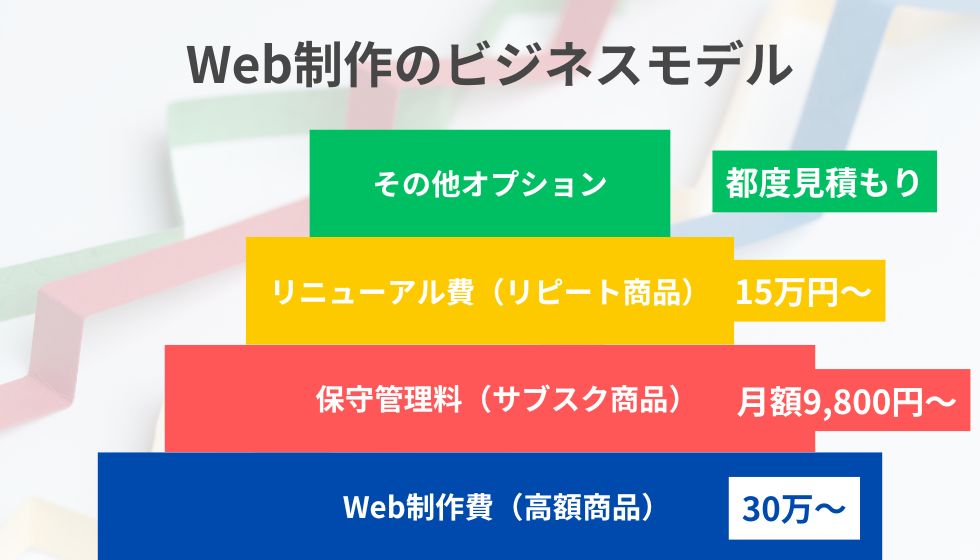 Web制作の仕事はストック収入型のビジネスモデルです。毎月サブスクで収入を確保できるので、案件をこなすほど収入が安定するんです!